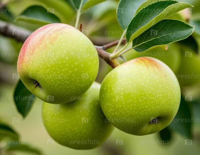 Зеленые яблоки на ветке в саду. Сгенерированный ИИ