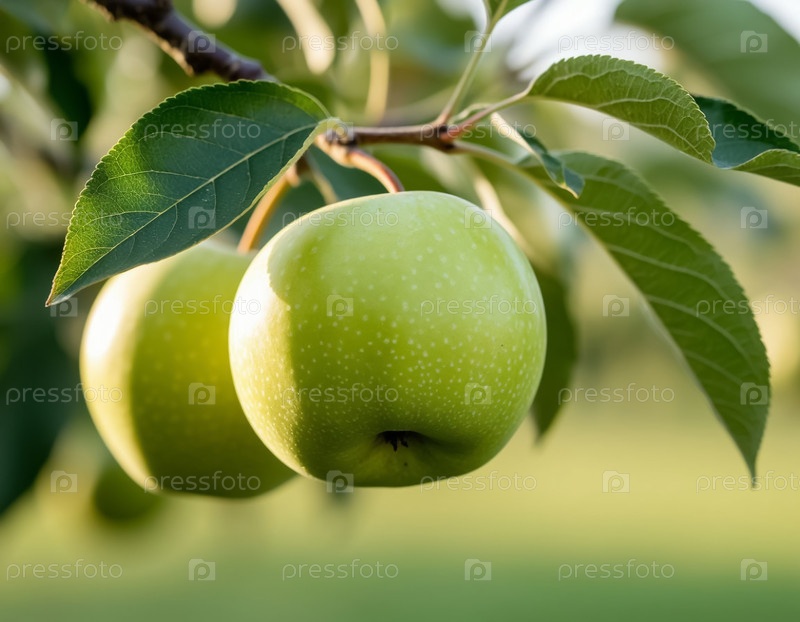 Зеленые яблоки на ветке в саду. Сгенерированный ИИ