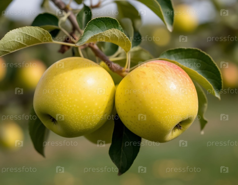 Желтые яблоки на ветке в саду. Сгенерированный ИИ