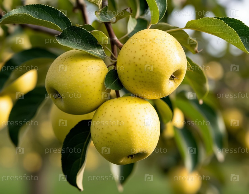 Желтые яблоки на ветке в саду. Сгенерированный ИИ
