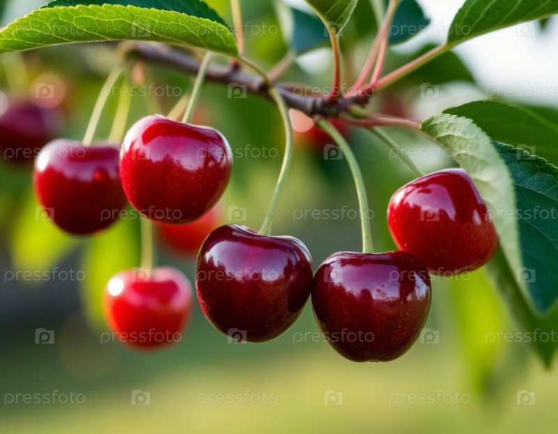 Спелая вишневая ягода на ветке в саду крупным планом. Генерируется ИИ