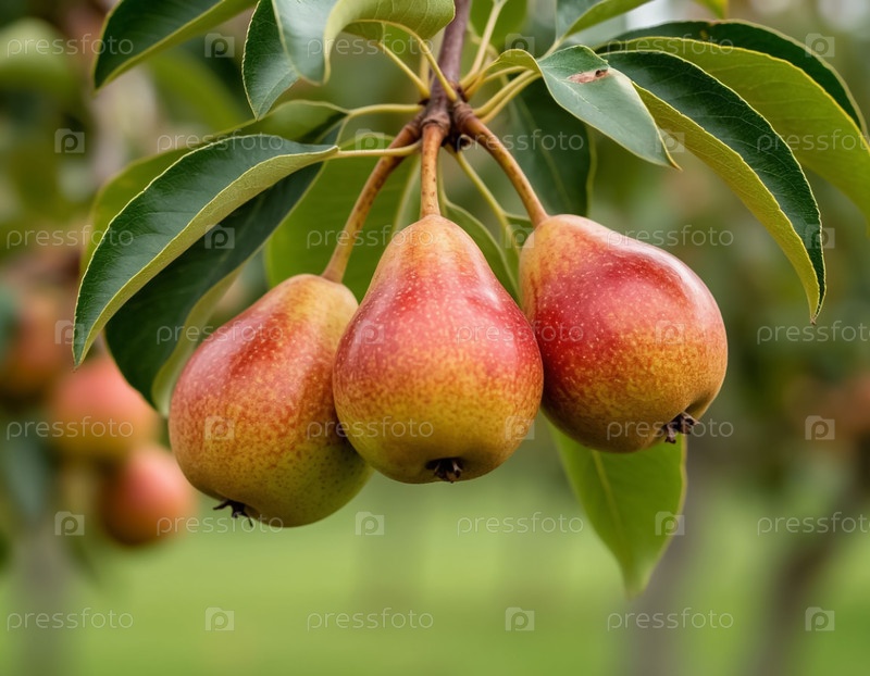 Груши созревают на ветке крупным планом в саду. Сельское хозяйство и сельское хозяйство. Генерируется ИИ