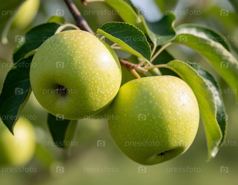 Зеленые яблоки на ветке в саду. Сгенерированный ИИ