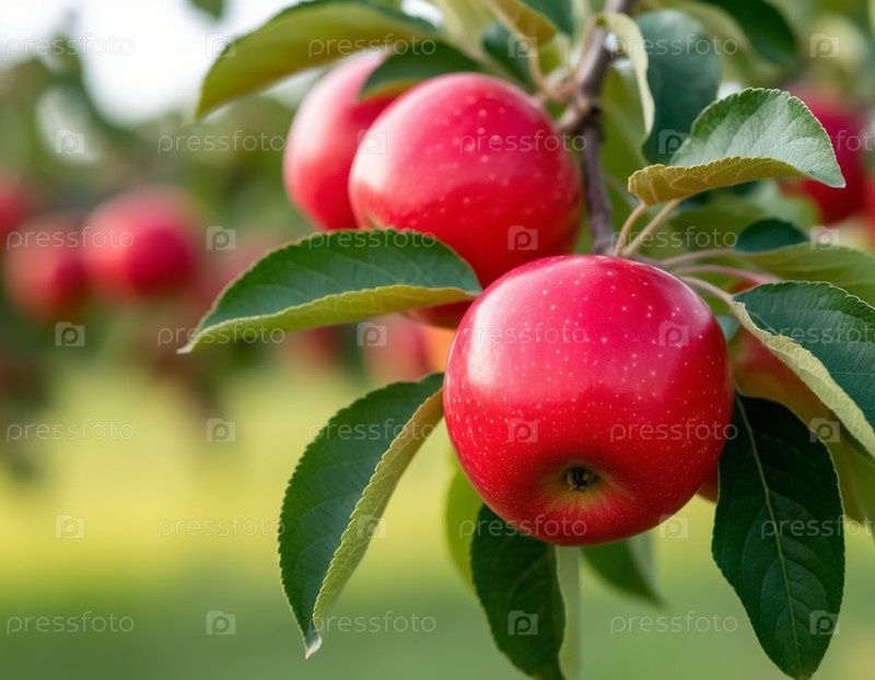 Красные яблоки на ветке в саду. Сгенерированный ИИ
