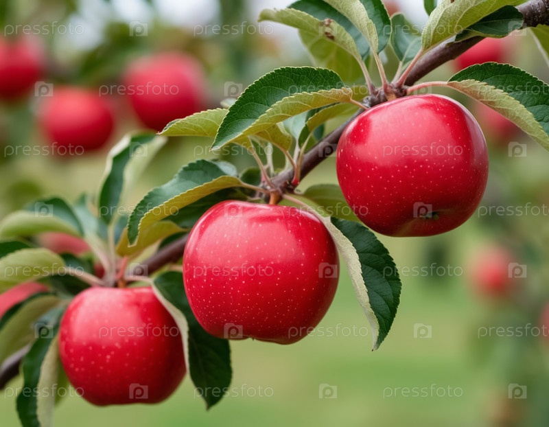 Красные яблоки на ветке в саду. Сгенерированный ИИ