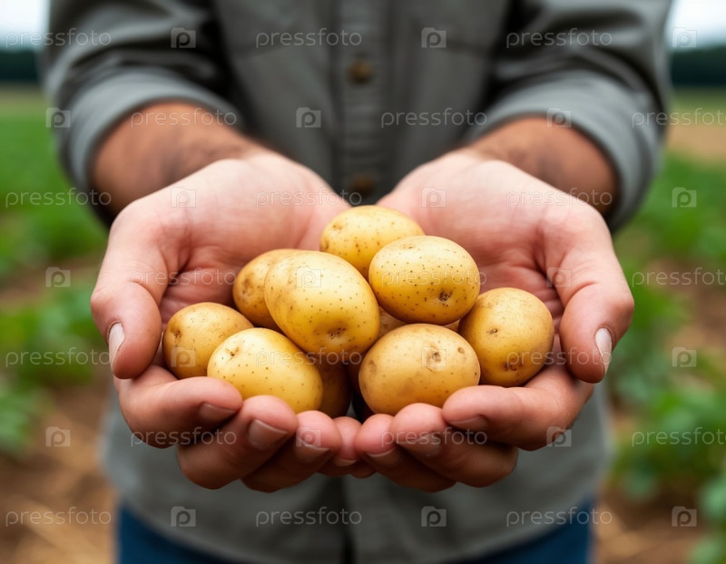 Картофель в руках фермера крупным планом. Сгенерированный ИИ