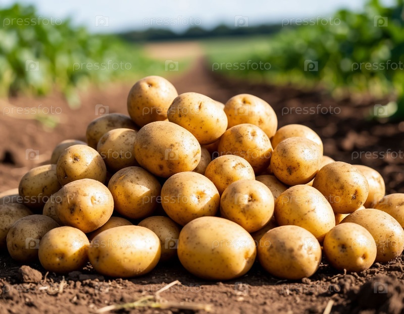 Груда картофеля против фермерского поля, крупным планом. Сгенерированный ИИ