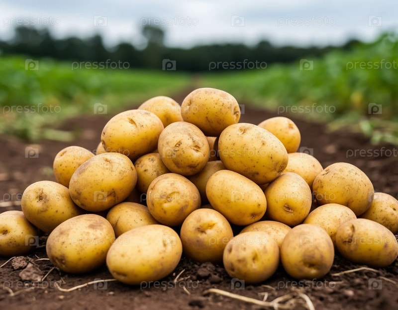 Груда картофеля против фермерского поля, крупным планом. Сгенерированный ИИ