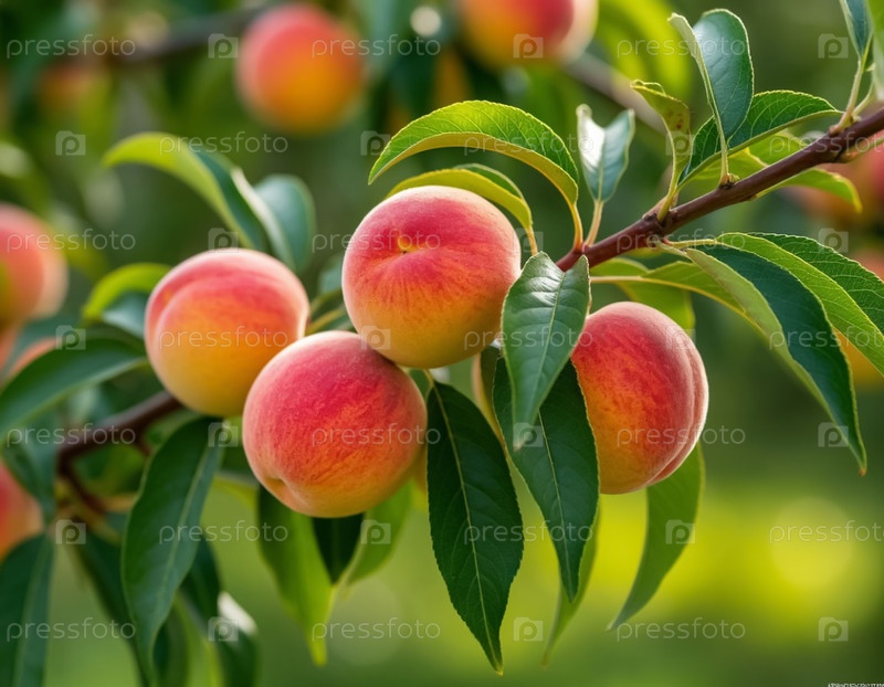 Персики созревают на ветке в саду. Сельское хозяйство и сельское хозяйство. Генерируется ИИ