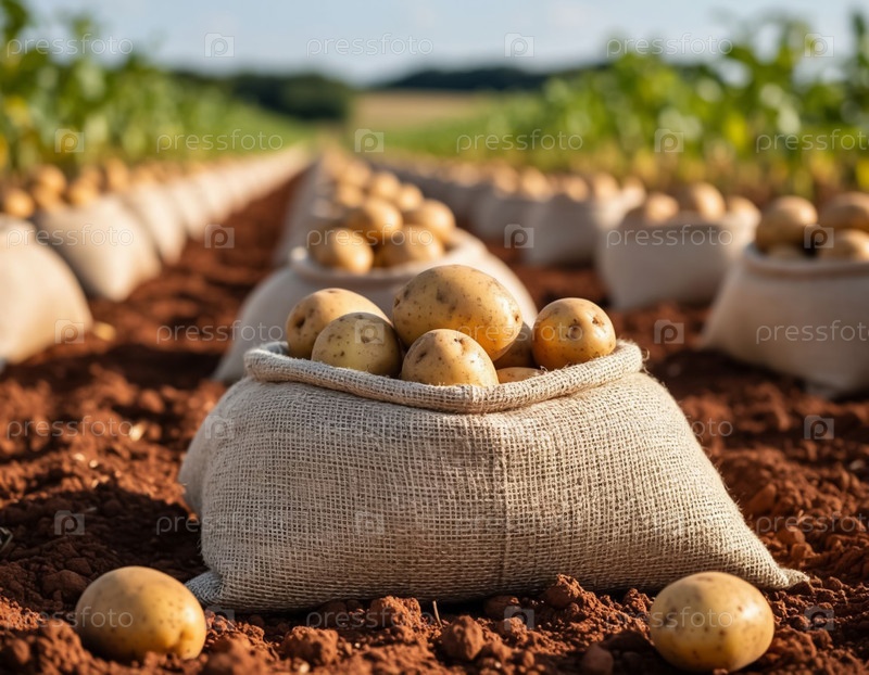 Картофель, собранный в мешки на фоне крупного фермерского поля. Сгенерированный ИИ