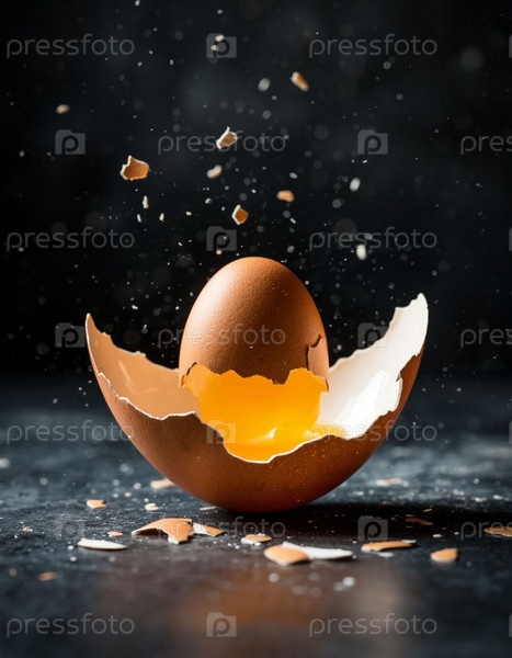 Яйцо динамически ломается в воздухе на черном фоне. Сгенерированный ИИ