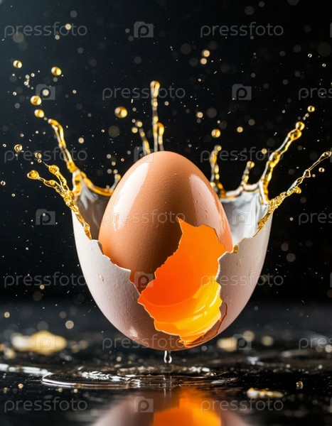 Яйцо динамически ломается в воздухе на черном фоне. Сгенерированный ИИ