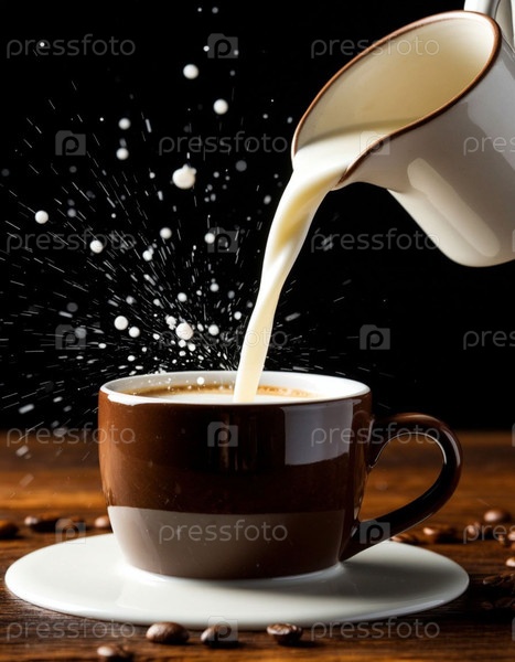 Поток молока льется в чашку. Сгенерированный ИИ