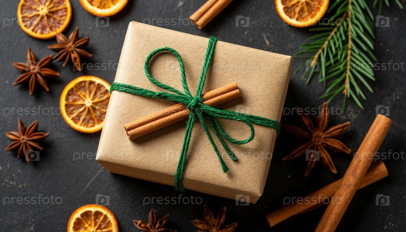 Новогодний подарок в коробке из крафт-бумаги, привязанной зеленой лентой. Рождественский фон, ваниль, сушеные апельсины и палочки из корицы. Генерируется ИИ