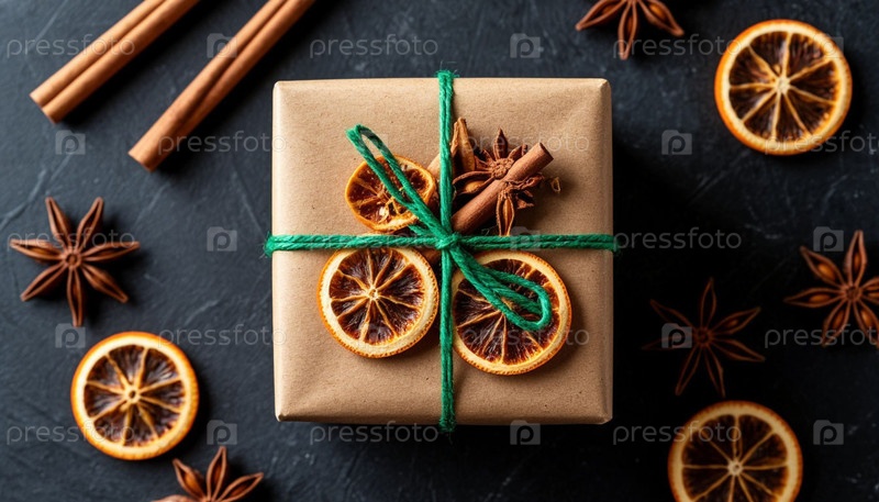 Новогодний подарок в коробке из крафт-бумаги, привязанной зеленой лентой. Рождественский фон, ваниль, сушеные апельсины и палочки из корицы. Генерируется ИИ