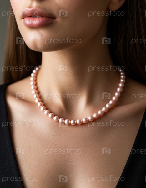 Ожерелье из розового жемчуга невесты на шее. Сгенерированный ИИ