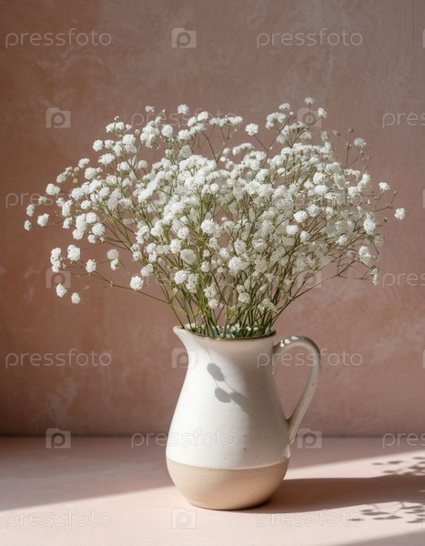 Букет гипсофилы в белом кувшине на бежевом стенном фоне. Генерируется ИИ