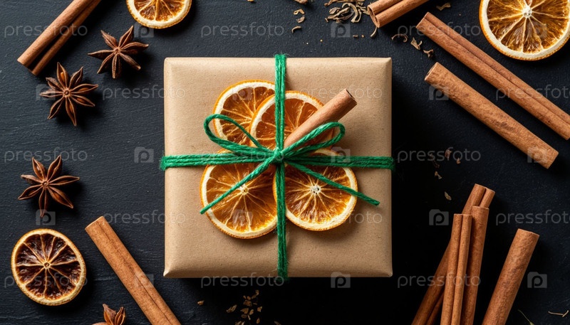 Новогодний подарок в коробке из крафт-бумаги, привязанной зеленой лентой. Рождественский фон, ваниль, сушеные апельсины и палочки из корицы. Генерируется ИИ
