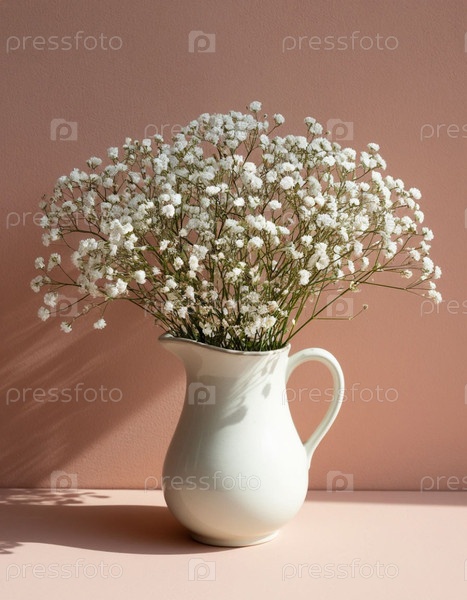 Букет гипсофилы в белом кувшине на бежевом стенном фоне. Генерируется ИИ