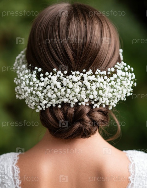Прическа невесты украшена цветами гипсофилы, вид со спины. Сгенерированный ИИ