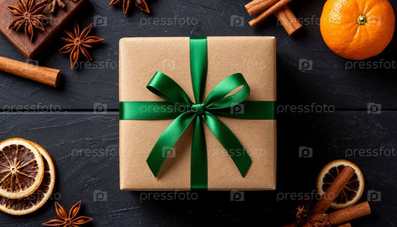 Новогодний подарок в коробке из крафт-бумаги, привязанной зеленой лентой. Рождественский фон, ваниль, сушеные апельсины и палочки из корицы. Генерируется ИИ