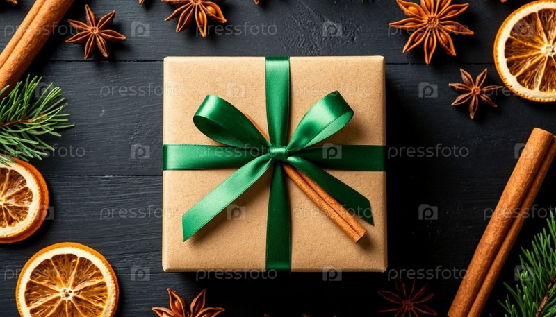 Новогодний подарок в коробке из крафт-бумаги, привязанной зеленой лентой. Рождественский фон, ваниль, сушеные апельсины и палочки из корицы. Генерируется ИИ