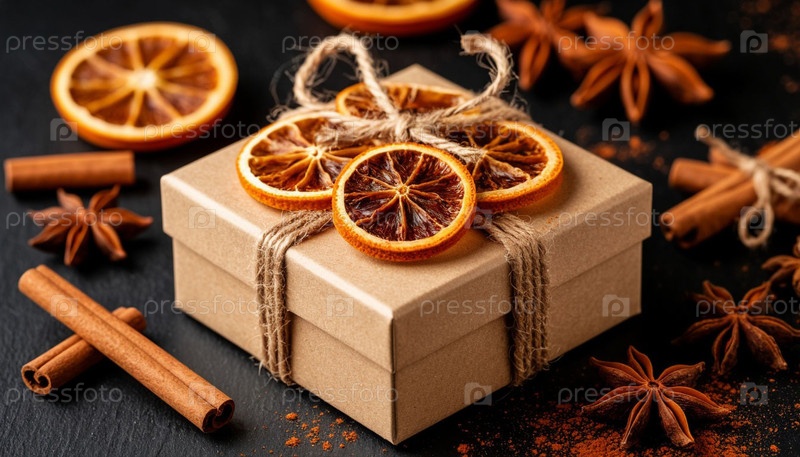 Новогодний подарок в крафт-боксе. Рождественский фон, ваниль, сушеные апельсины и палочки из корицы. Сгенерированный ИИ