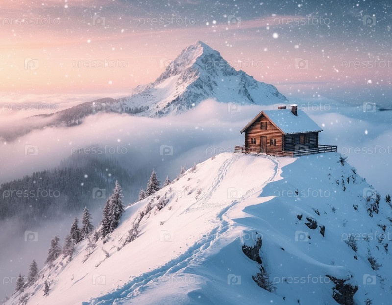 Одинокий дом на вершине снежной горы. Сгенерированный ИИ