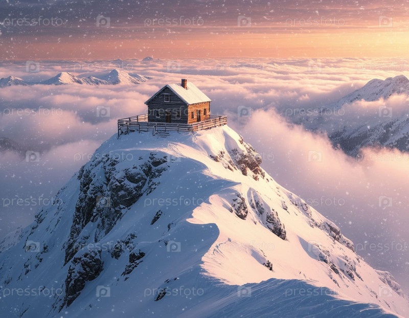 Одинокий дом на вершине снежной горы. Сгенерированный ИИ