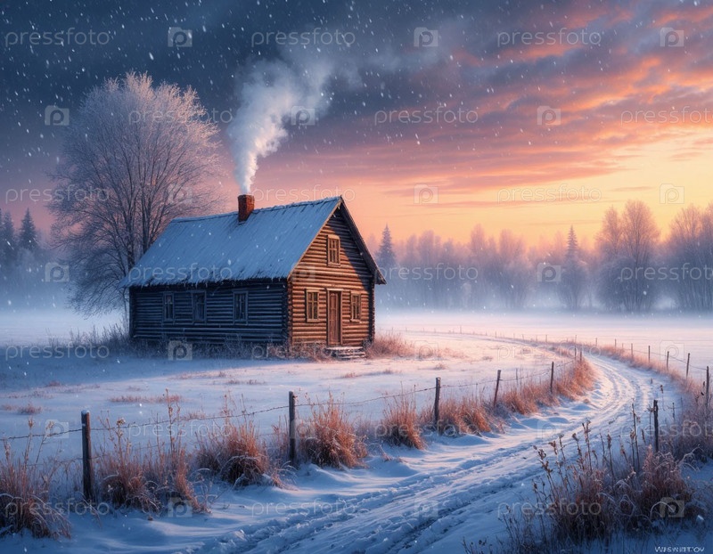 Одинокий дом на окраине снежной деревни. Сгенерированный ИИ