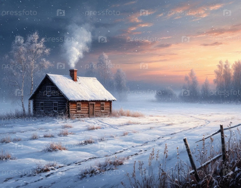 Одинокий дом на окраине снежной деревни. Сгенерированный ИИ