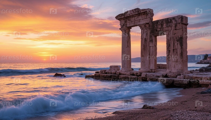 Древние руины на берегу моря. Сгенерированный ИИ