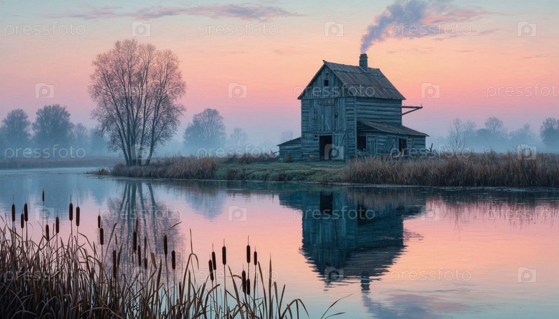 Одинокий деревенский дом у воды на рассвете в тумане, цифровая иллюстрация. Сгенерированный ИИ