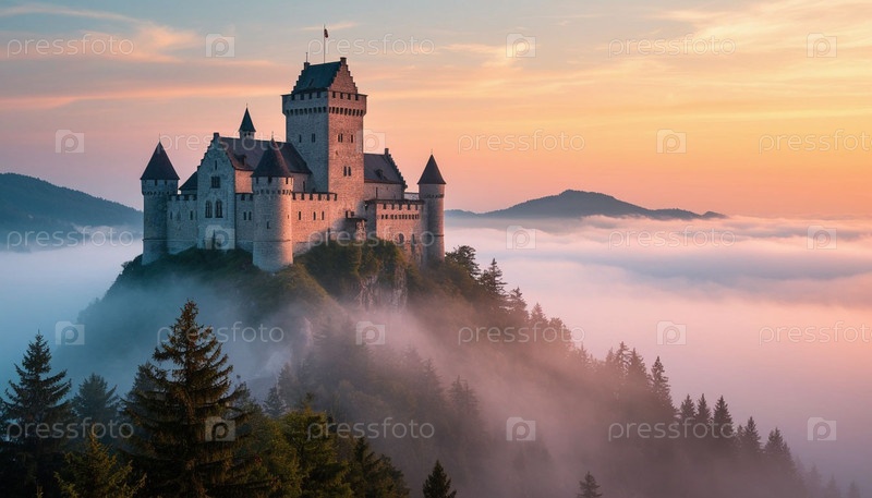 Мистическая крепость на горе в тумане. Сгенерированный ИИ