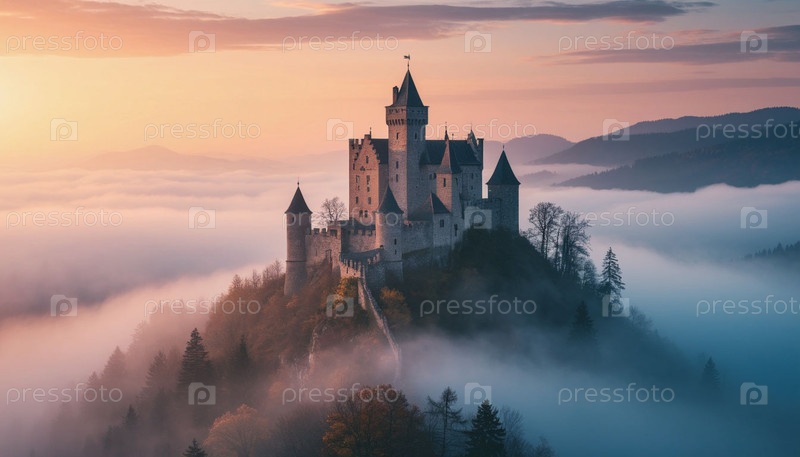 Мистическая крепость на горе в тумане. Сгенерированный ИИ
