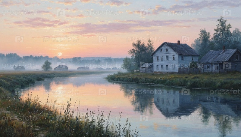 Туманный восход солнца в деревне, цифровая иллюстрация. Сгенерированный ИИ