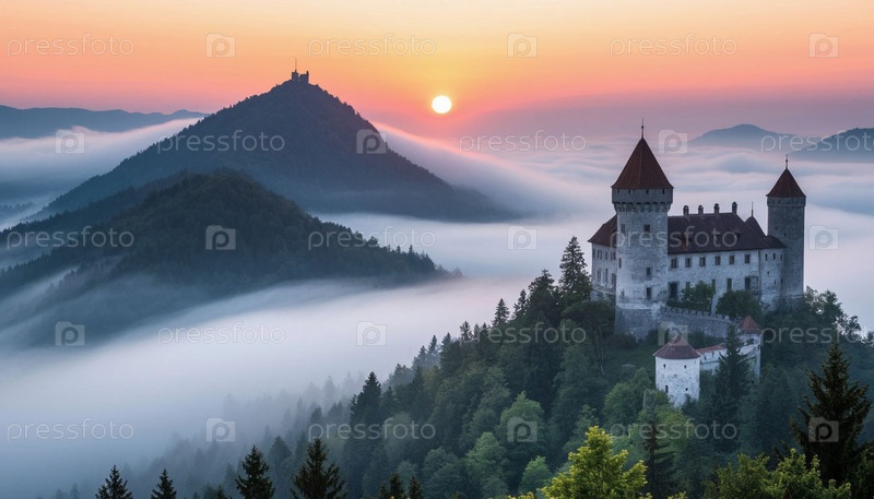 Мистическая крепость на горе в тумане. Сгенерированный ИИ