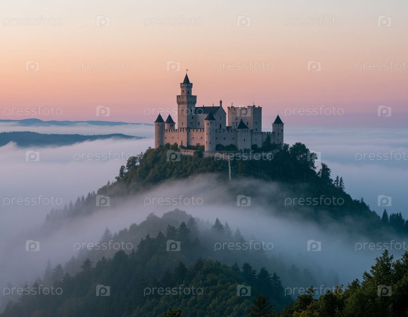 Мистическая крепость на горе в тумане. Сгенерированный ИИ