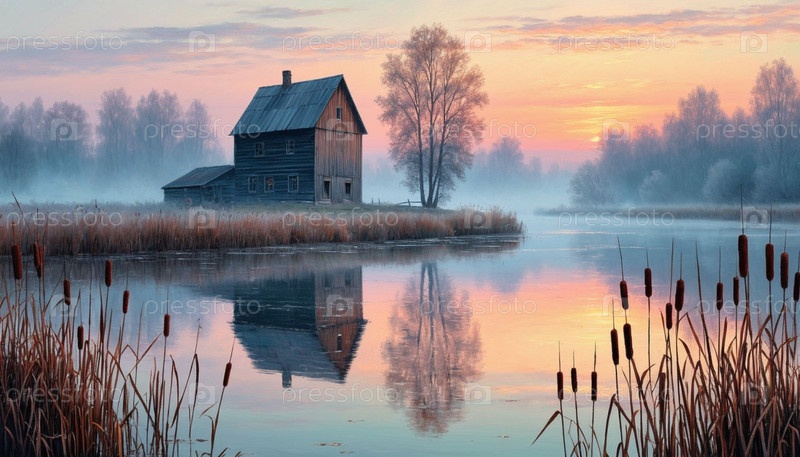 Одинокий деревенский дом у воды на рассвете в тумане, цифровая иллюстрация. Сгенерированный ИИ