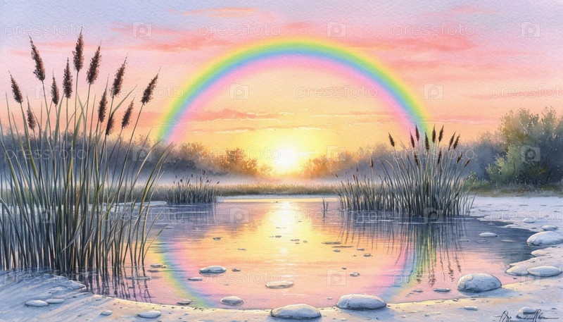 Пастельная радуга над озером, иллюстрация. Сгенерированный ИИ