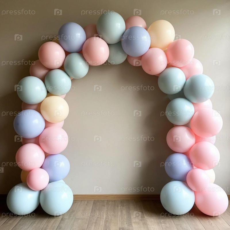 Пастельные баллоны арки на стене, фотозона, копировальное пространство. Сгенерированный ИИ