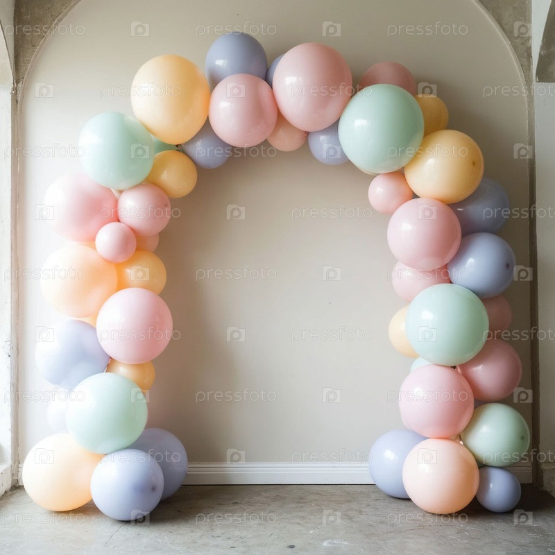 Пастельные баллоны арки на стене, фотозона, копировальное пространство. Сгенерированный ИИ