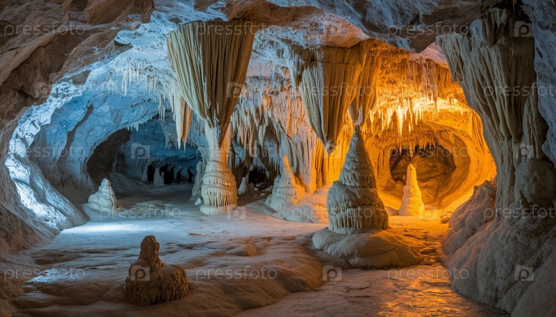Сказочная пещера известняковых пород со сталактитами. Сгенерированный ИИ