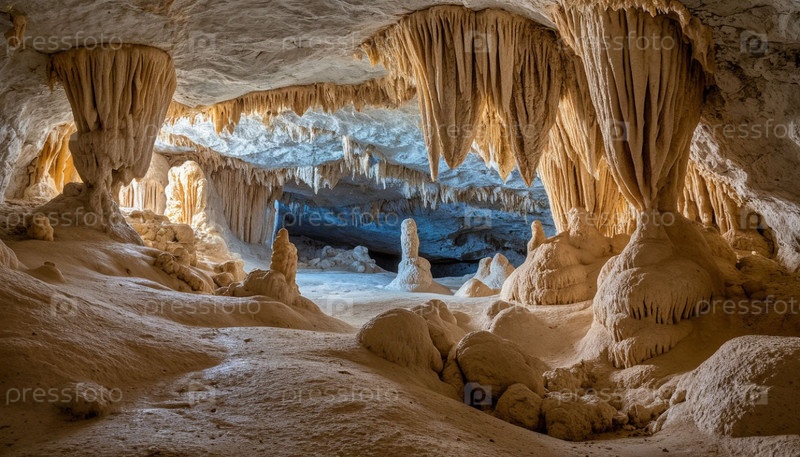 Сказочная пещера известняковых пород со сталактитами. Сгенерированный ИИ