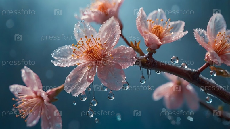 Минимализм. Цветы на ветвях дерева. Цветет розовое дерево сакуры, мокрое от дождя. Наступила весна, и природа оживает. Красивые цветы с каплями воды