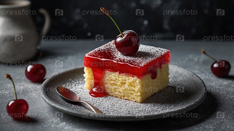 Вкусный, губчатый торт с вишней с украшением в виде вишни на серой керамической пластине. Очень вкусный десерт крупным планом