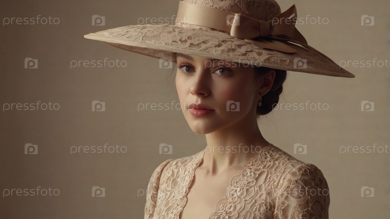 Минимализм. Студийный портрет стильной, элегантной женщины в ретро платье и большой шляпе с луком. Мода 1950-х годов. В прошлом веке