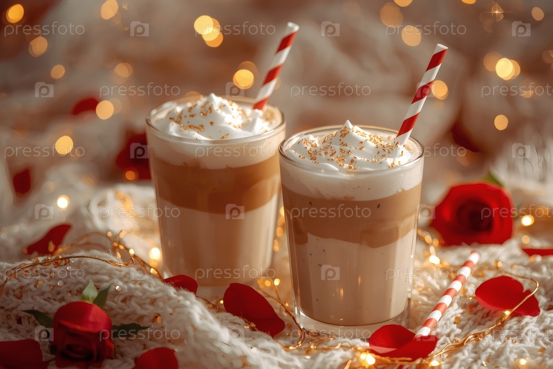 Концепт кафе или кафе в честь Дня святого Валентина. Вкусный многослойный кофе в прозрачном стакане, сердца и лепестки роз крупным планом