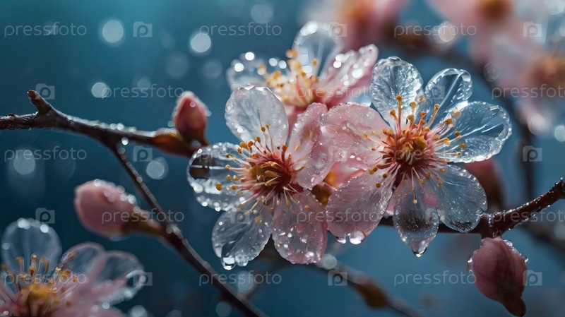 Минимализм. Цветы на ветвях дерева. Цветет розовое дерево сакуры, мокрое от дождя. Наступила весна, и природа оживает. Красивые цветы с каплями воды