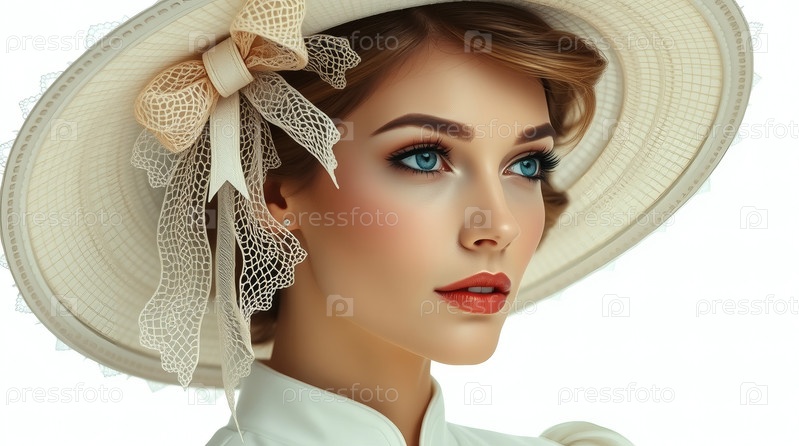 Минимализм. Студийный портрет стильной, элегантной женщины в ретро платье и большой шляпе с луком. Мода 1950-х годов. В прошлом веке